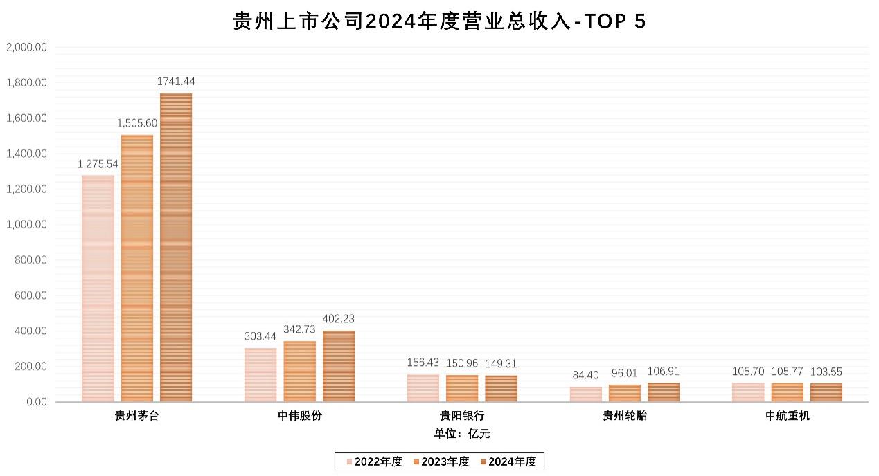 从个体层面来看,2024年度贵州共有31家上市公司营业总收入突破10亿元。其中,贵州茅台向两千亿规模稳步前进,中伟股份成功突破四百亿规模,贵阳银行、中航重机在百亿级别保持稳健经营,而贵州轮胎成功跨入百亿序列。