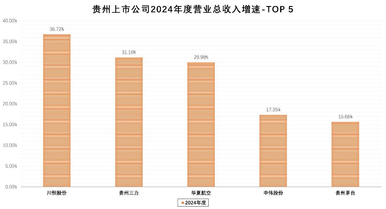 在营业总收入个体增长方面,川恒股份、贵州三力、华夏航空、中伟股份、贵州茅台增速居前,且保持两位数增长。其中,川恒股份和贵州三力增速均超30%。另外,贵州燃气、赤天化、红星发展等公司营业总收入止跌转增。值得一提的是,2024年度有8家公司连续三年营业总收入持续正增长,其中贵州茅台、中伟股份、贵州轮胎、川恒股份、沃顿科技实现连续5年增速向上。