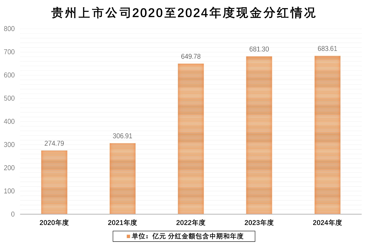 从分红额度来看,贵州上市公司2024年“年度已宣告+年中已实施”的分红总额达683.61亿元,连续5年持续提升,分红次数和分红规模再创历史新高。此外,贵州燃气、红星发展、川恒股份、黔源电力已作出2025年中期分红安排,贵州上市公司现金分红的“稳定性、持续性、可预期性”态势显著增强。