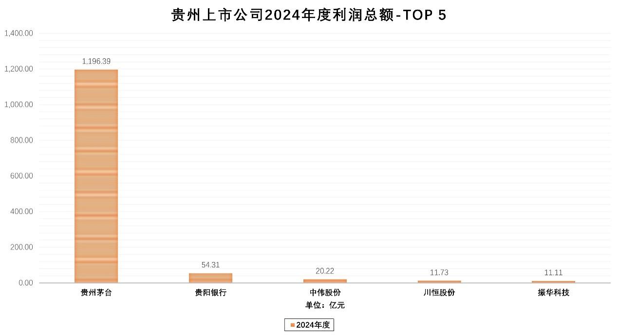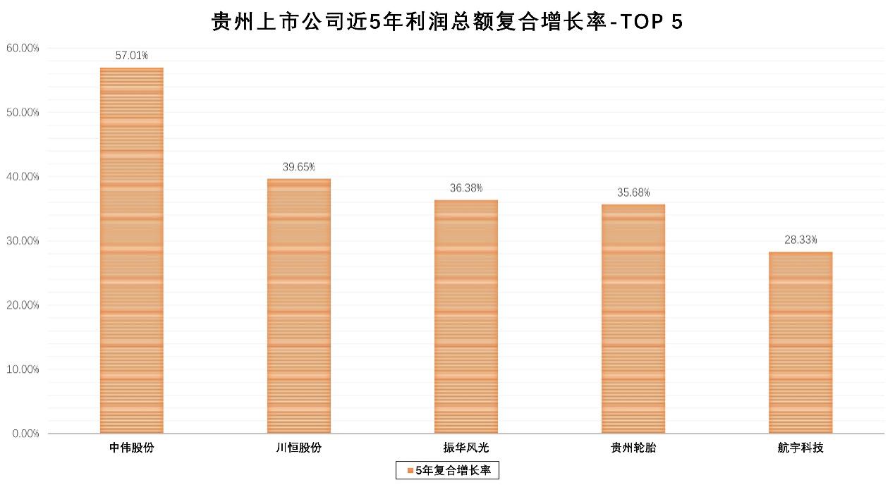 2024年,贵州共有25家上市公司实现盈利,占比71.43%,20家公司利润总额超过亿元,贵州茅台、贵阳银行、中伟股份、川恒股份、振华科技规模居前,永吉股份(维权)、红星发展和川恒股份的增长幅度超20%,贵州轮胎、振华风光等公司近5年利润总额复合增长率均超过25%。