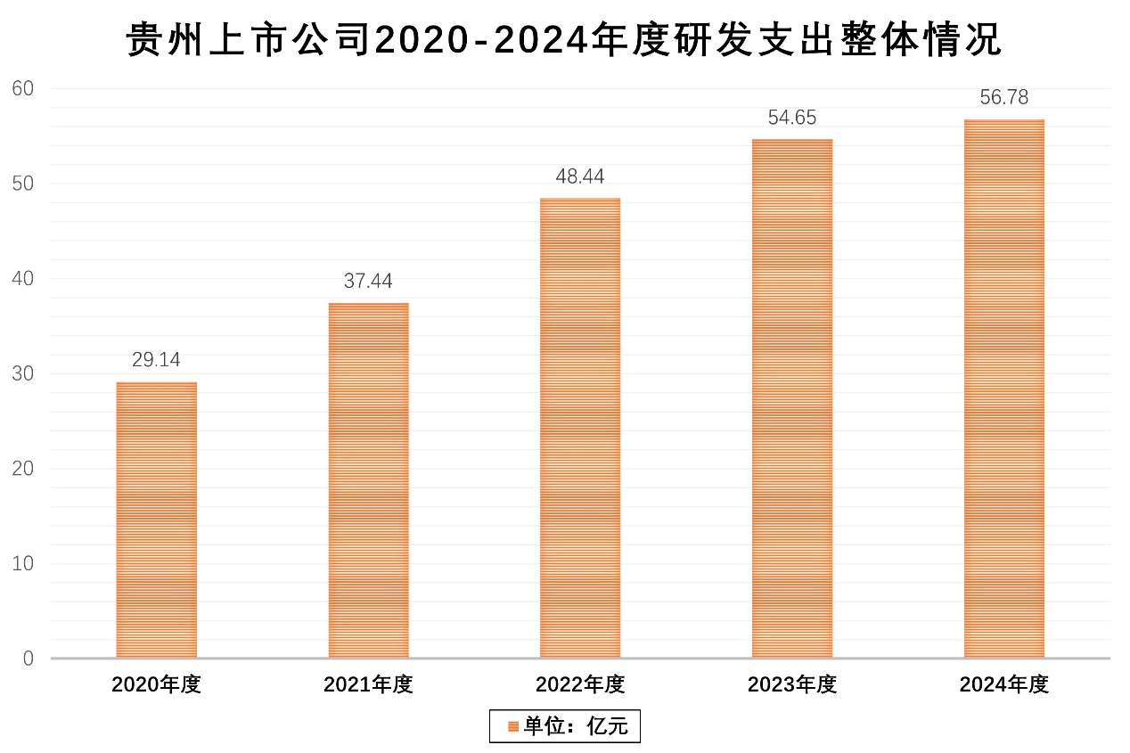 2024年,贵州上市公司在科技创新方面投入持续加大,研发费用支出合计56.78亿元,同比提升3.89%,连续5年实现增长。