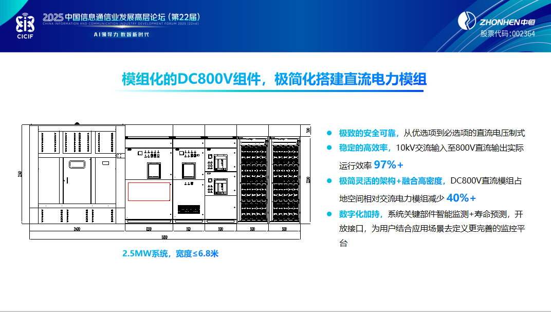 在2025中国信息通信业发展高层论坛上,杭州中恒电气(002364)股份有限公司IDC事业部总经理李善策先生发表了题为“AIDC直流800V产品定义与探讨”的精彩演讲,为与会者呈现了数据中心电源系统在人工智能时代的新发展与新机遇。